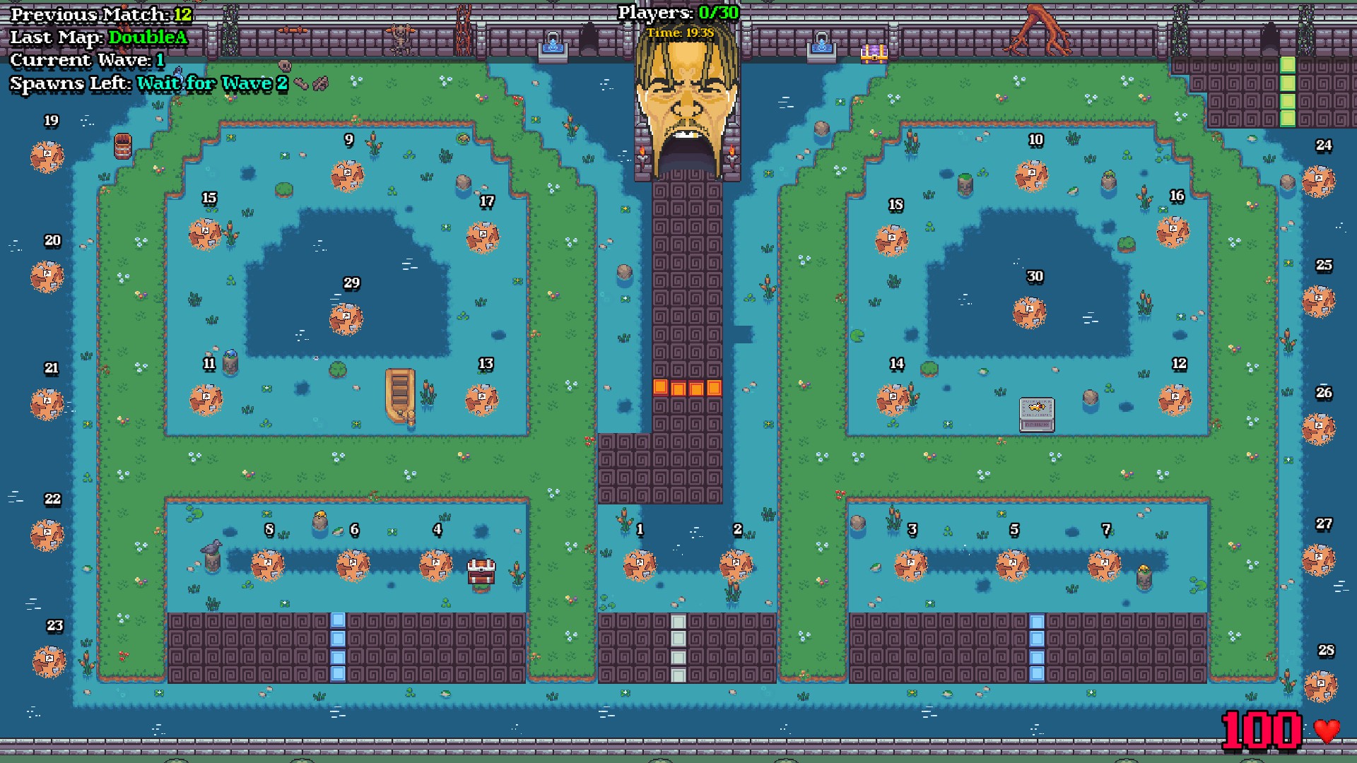 Mobs will spawn from the north center entrance and make their way around the “U” shaped maze towers the top right. They will eventually meet the bottom left section where they will circle around slots seventeen through twenty before making their way to the escape. At wave ten and above the mobs will attempt to take the fastest route possible.