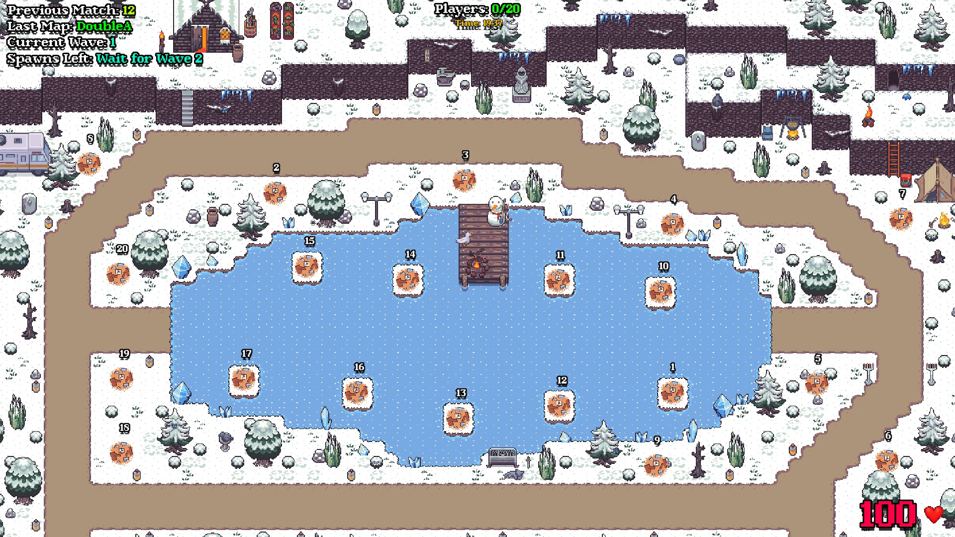 CampingIsFun is a medium sized map with eighteen player slots. Mobs will begin to spawn from the right below slot 18, making their way around the initial square before moving up and left. The mobs will eventually wrap around slot 10 and make their way towards the end of the map. At wave 10 and up mobs will start to break away from the longer path and will avoid circling around the squares in a faster attempt at escaping.